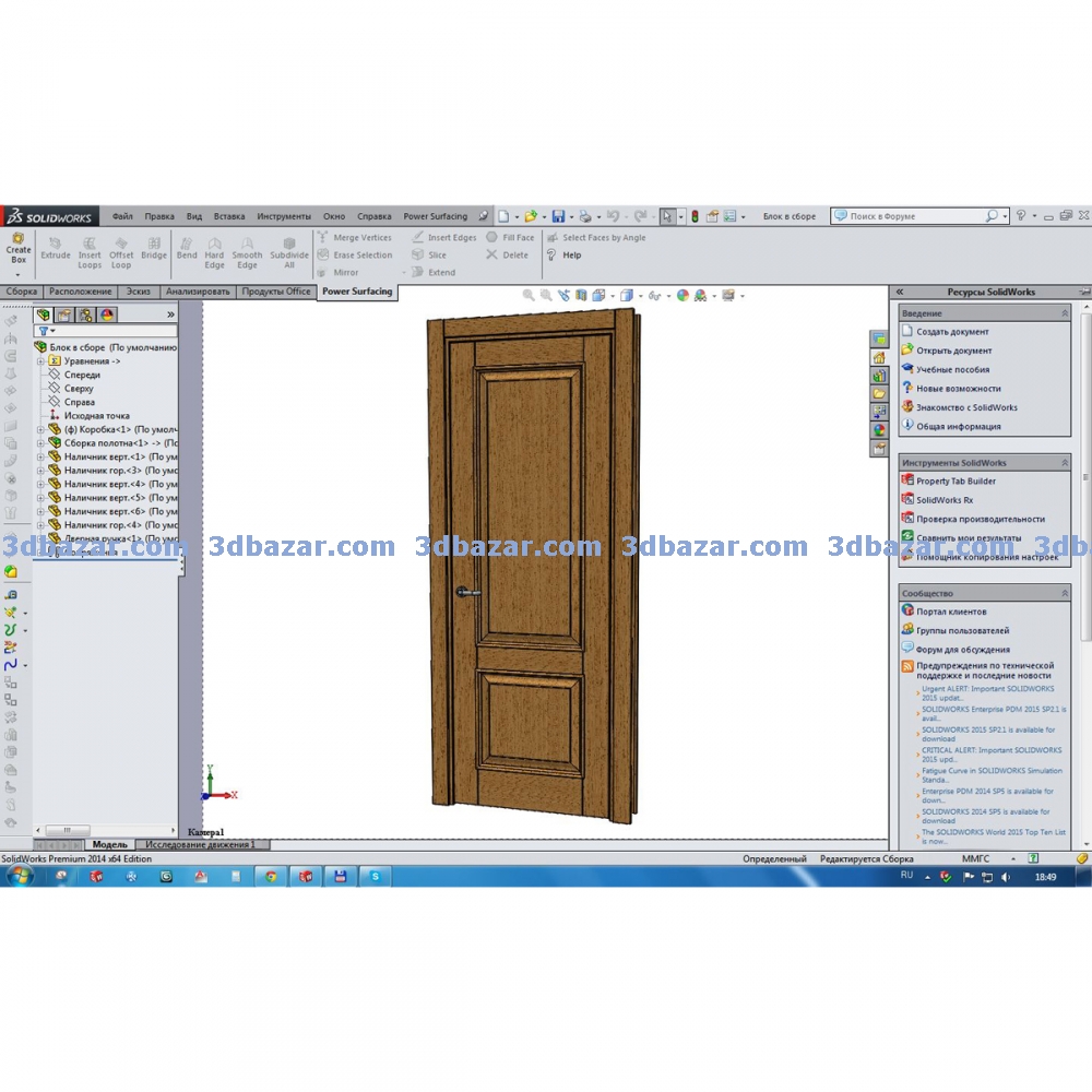 Дверной блок, среда моделирования SolidWorks 2014, габаритные размеры по коробке 2150 х 850 х 120 мм, полностью параметрическая модель перестраивается по глобальным размерам высоте ширине и глубине коробки.