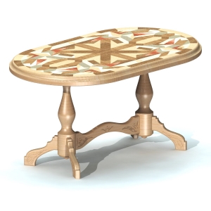 Стол из массива дерева с инкрустацией столешницы в стиле маркетри шпоном разных пород дерева и резными элементами. Модель состоит из 12 деталей в архиве имеются файлы для экспорта.