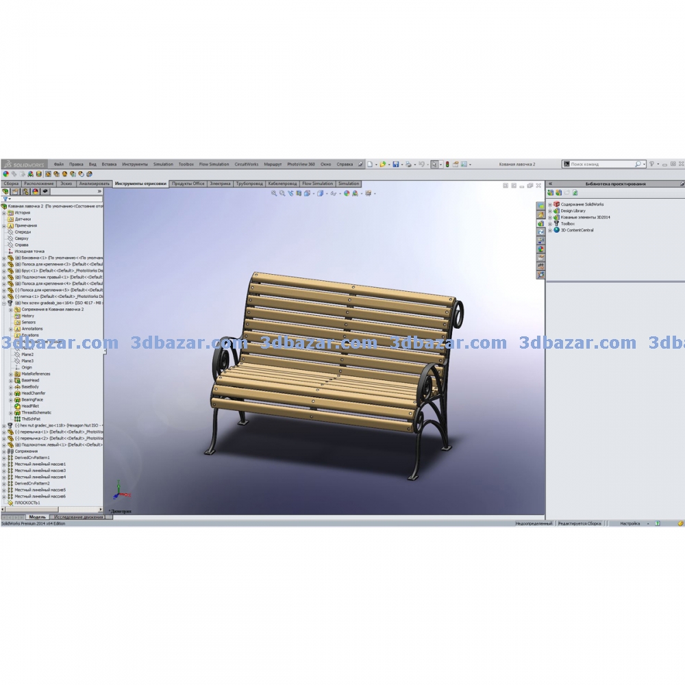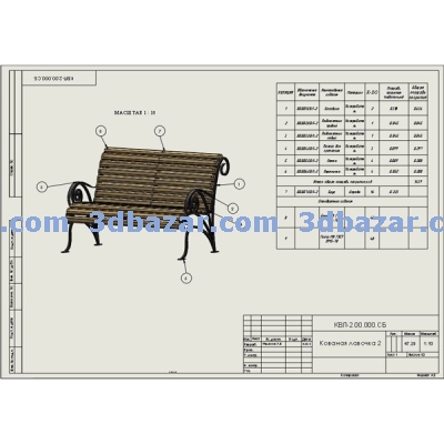 Скамья кованая, основной конструктив выполнен из квадрата сечением 16 мм и полосой 40х4. Подробно проработанная сборка SolidWorks. Скамья смоделирована в масштабе 1:1. Основная деталь (боковина) обработана кузнечным способом, при помощи несложных операций. Выполнена чертёжная документация. Для импорта в другие CAD системы модель сохранена в формате *STL,*X_B, *IGS.