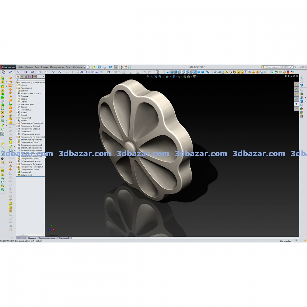Розетка декоративная. Среда разработки SolidWorks. Может использоваться как декоративный элемент для мебели или дверных блоков. Подробно проработанная модель позволяет использовать ее как в своих проектах, так и для написания программ для ЧПУ.